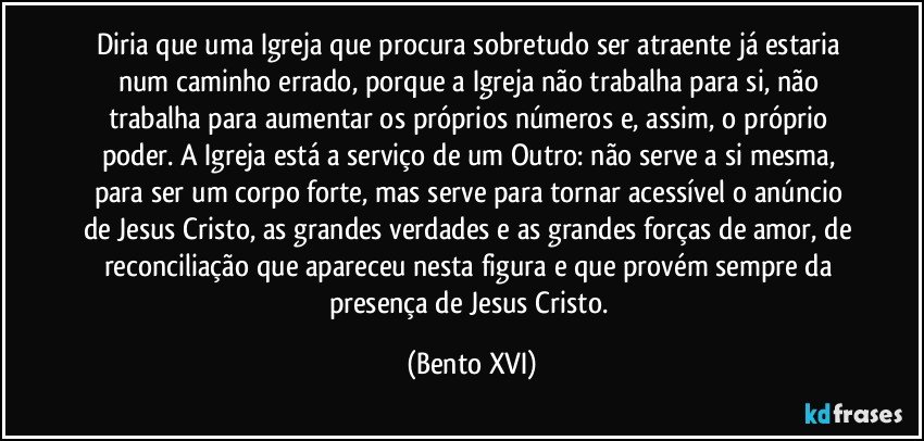 Diria que uma Igreja que procura sobretudo ser atraente já estaria num caminho errado, porque a Igreja não trabalha para si, não trabalha para aumentar os próprios números e, assim, o próprio poder. A Igreja está a serviço de um Outro: não serve a si mesma, para ser um corpo forte, mas serve para tornar acessível o anúncio de Jesus Cristo, as grandes verdades e as grandes forças de amor, de reconciliação que apareceu nesta figura e que provém sempre da presença de Jesus Cristo.