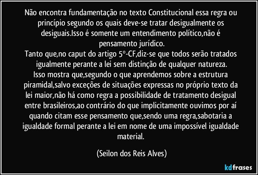 Não encontra fundamentação no texto Constitucional essa regra ou princípio segundo os quais deve-se tratar desigualmente os desiguais.Isso é somente um entendimento político,não é pensamento jurídico.