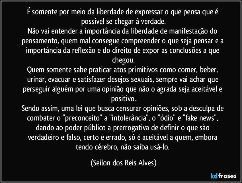 | “ É somente por meio da liberdade de expressar o que pensa que é possível se chegar à verdade. Não vai entender a importância da liberdade de manifestação do pensamento, quem mal consegue compreender o que seja pensar e a importância da reflexão e do direito de expor as conclusões a que chegou. Quem somente sabe praticar atos primitivos como comer, beber, urinar, evacuar e satisfazer desejos sexuais, sempre vai achar que perseguir alguém por uma opinião que não o agrada seja aceitável e positivo. Sendo assim, uma lei que busca censurar opiniões, sob a desculpa de combater o "preconceito" a "intolerância", o "ódio" e "fake news", dando ao poder público a prerrogativa de definir o que são verdadeiro e falso, certo e errado, só é aceitável a quem, embora tendo cérebro, não saiba usá-lo.” ― Seilon dos Reis Alves |
