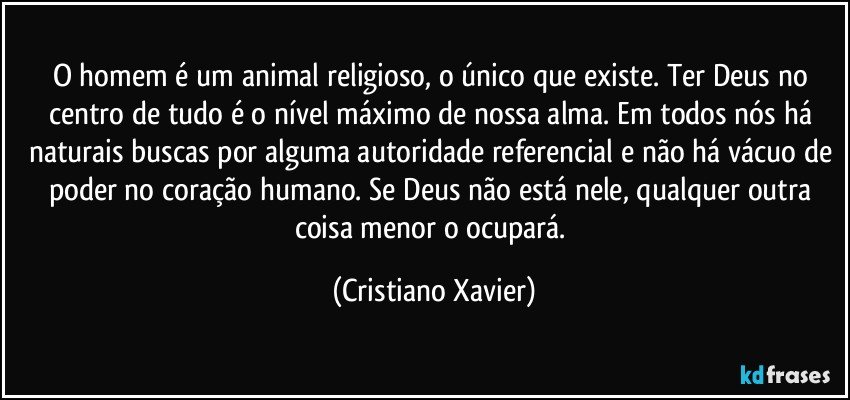 O homem é um animal religioso, o único que existe. Ter Deus no centro de tudo é o nível máximo de nossa alma. Em todos nós há naturais buscas por alguma autoridade referencial e não há vácuo de poder no coração humano. Se Deus não está nele, qualquer outra coisa menor o ocupará.
