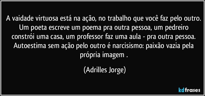 A vaidade virtuosa está na ação, no trabalho que você faz pelo outro. Um poeta escreve um poema pra outra pessoa, um pedreiro constrói uma casa, um professor faz uma aula - pra outra pessoa. Autoestima sem ação pelo outro é narcisismo: paixão vazia pela própria imagem .