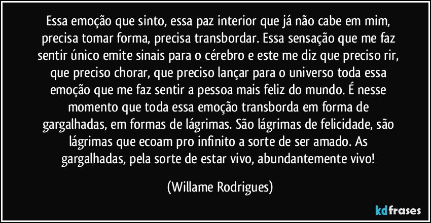 Essa emoção que sinto, essa paz interior que já não cabe em mim, precisa tomar forma, precisa transbordar. Essa sensação que me faz sentir único emite sinais para o cérebro e este me diz que preciso rir, que preciso chorar, que preciso lançar para o universo toda essa emoção que me faz sentir a pessoa mais feliz do mundo. É nesse momento que toda essa emoção transborda em forma de gargalhadas, em formas de lágrimas. São lágrimas de felicidade, são lágrimas que ecoam pro infinito a sorte de ser amado. As gargalhadas, pela sorte de estar vivo, abundantemente vivo! (Willame Rodrigues)