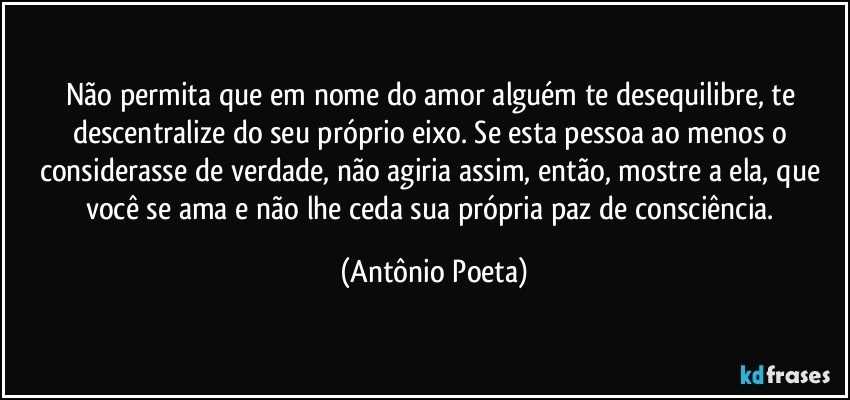 Não permita que em nome do amor alguém te desequilibre, te descentralize do seu próprio eixo. Se esta pessoa ao menos o considerasse de verdade, não agiria assim, então, mostre a ela, que você se ama e não lhe ceda sua própria paz de consciência.