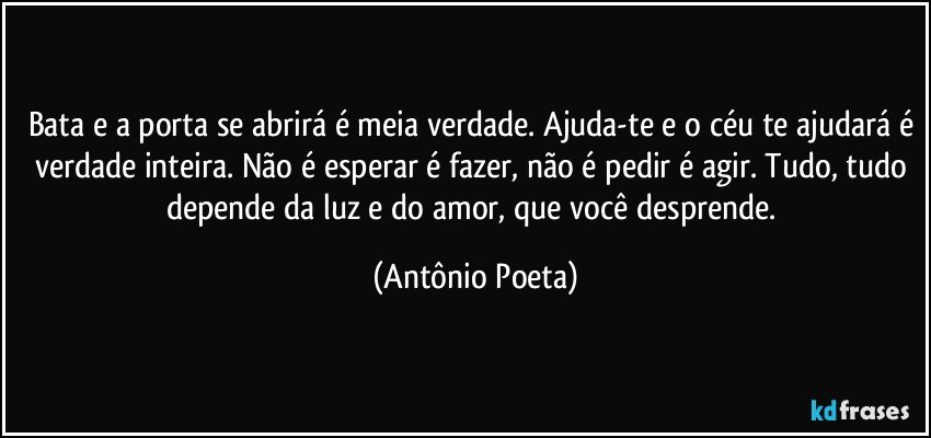 Bata e a porta se abrirá é meia verdade. Ajuda-te e o céu te ajudará é verdade inteira. Não é esperar é fazer, não é pedir é agir. Tudo, tudo depende da luz e do amor, que você desprende.