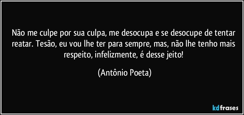 Não me culpe por sua culpa, me desocupa e se desocupe de tentar reatar. Tesão, eu vou lhe ter para sempre, mas, não lhe tenho mais respeito, infelizmente, é desse jeito!