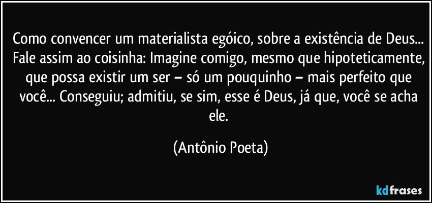 Como convencer um materialista egóico, sobre a existência de Deus... Fale assim ao coisinha: Imagine comigo, mesmo que hipoteticamente, que possa existir um ser – só um pouquinho – mais perfeito que você... Conseguiu; admitiu, se sim, esse é Deus, já que, você se acha ele.