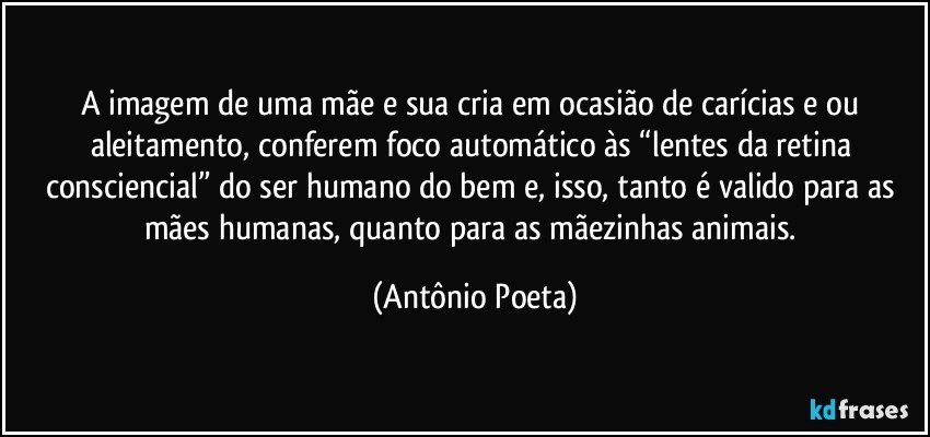 A imagem de uma mãe e sua cria em ocasião de carícias e/ou aleitamento, conferem foco automático às “lentes da retina consciencial” do ser humano do bem e, isso, tanto é valido para as mães humanas, quanto para as mãezinhas animais.