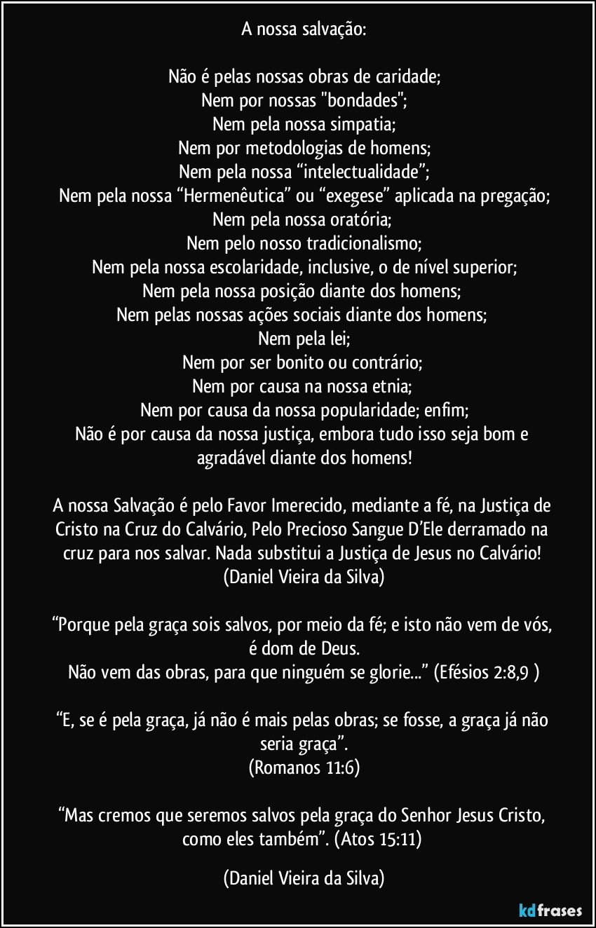 | “ A nossa salvação: Não é pelas nossas obras de caridade; Nem por nossas "bondades"; Nem pela nossa simpatia; Nem por metodologias de homens; Nem pela nossa “intelectualidade”; Nem pela nossa “Hermenêutica” ou “exegese” aplicada na pregação; Nem pela nossa oratória; Nem pelo nosso tradicionalismo; Nem pela nossa escolaridade, inclusive, o de nível superior; Nem pela nossa posição diante dos homens; Nem pelas nossas ações sociais diante dos homens; Nem pela lei; Nem por ser bonito ou contrário; Nem por causa na nossa etnia; Nem por causa da nossa popularidade; enfim; Não é por causa da nossa justiça, embora tudo isso seja bom e agradável diante dos homens! A nossa Salvação é pelo Favor Imerecido, mediante a fé, na Justiça de Cristo na Cruz do Calvário, Pelo Precioso Sangue D’Ele derramado na cruz para nos salvar. Nada substitui a Justiça de Jesus no Calvário! (Daniel Vieira da Silva) “Porque pela graça sois salvos, por meio da fé; e isto não vem de vós, é dom de Deus. Não vem das obras, para que ninguém se glorie...” (Efésios 2:8,9 ) “E, se é pela graça, já não é mais pelas obras; se fosse, a graça já não seria graça”. (Romanos 11:6) “Mas cremos que seremos salvos pela graça do Senhor Jesus Cristo, como eles também”. (Atos 15:11)” |