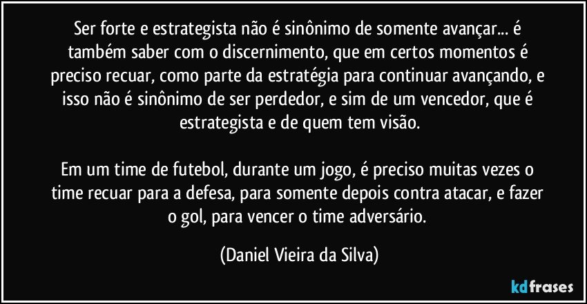 | “ Ser forte e estrategista não é sinônimo de somente avançar... é também saber com o discernimento, que em certos momentos é preciso recuar, como parte da estratégia para continuar avançando, e isso não é sinônimo de ser perdedor, e sim de um vencedor, que é estrategista e de quem tem visão. Em um time de futebol, durante um jogo, é preciso muitas vezes o time recuar para a defesa, para somente depois contra atacar, e fazer o gol, para vencer o time adversário.” |