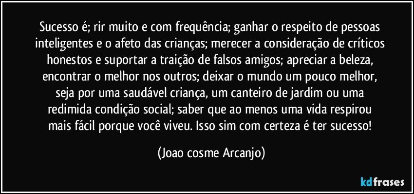Sucesso é; rir muito e com frequência; ganhar o respeito de pessoas inteligentes e o afeto das crianças; merecer a consideração de críticos honestos e suportar a traição de falsos amigos; apreciar a beleza, encontrar o melhor nos outros; deixar o mundo um pouco melhor, seja por uma saudável criança, um canteiro de jardim ou uma redimida condição social; saber que ao menos uma vida respirou mais fácil porque você viveu. Isso sim com certeza é ter sucesso!