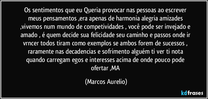 Os sentimentos que eu Queria provocar nas pessoas ao escrever meus pensamentos ,era apenas de harmonia alegria  amizades ,vivemos num  mundo de competividades , você pode ser invejado e amado , é quem decide sua felicidade seu caminho e passos onde ir vrncer todos  tiram como exemplos se ambos forem de sucessos ,  raramente  nas decadencias e sofrimento  alguém ti ver ti nota quando carregam egos e interesses acima de onde pouco pode ofertar ,MA (Marcos Aurelio)