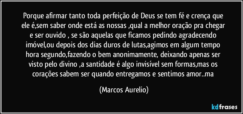 Porque afirmar  tanto toda perfeição de Deus se tem fé  e crença que ele é,sem saber onde está as nossas ,qual a melhor oração pra chegar e ser ouvido , se são  aquelas  que ficamos pedindo agradecendo imóvel,ou depois dos dias duros de lutas,agimos em algum tempo hora segundo,fazendo o bem anonimamente, deixando apenas ser visto pelo divino ,a santidade  é algo invisível sem formas,mas os corações sabem ser quando entregamos e sentimos amor..ma (Marcos Aurelio)