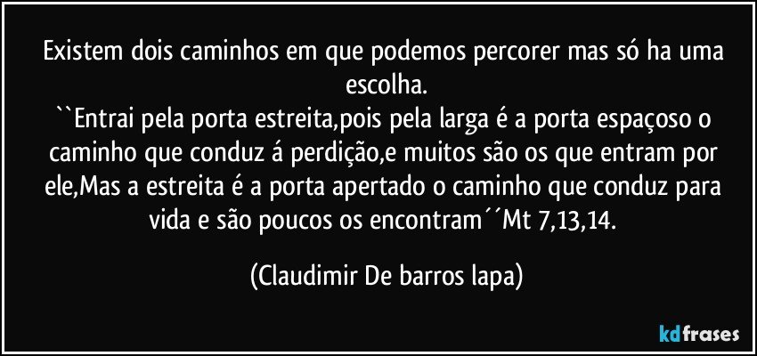 ``Entrai pela porta estreita,pois pela larga é a porta espaçoso o caminho que conduz á perdição,e muitos são os que entram por ele,Mas a estreita é a porta apertado o caminho que conduz para vida e são poucos os encontram´´Mt 7,13,14.