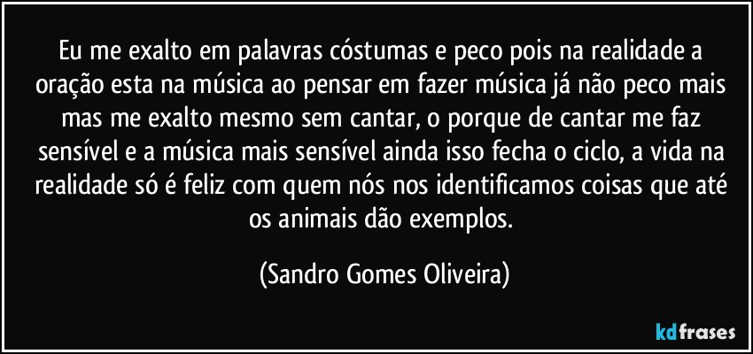 Eu me exalto em palavras cóstumas e peco pois na realidade a oração esta na música ao pensar em fazer música já não peco mais mas me exalto mesmo sem cantar, o porque de cantar me faz sensível e a música mais sensível ainda isso fecha o ciclo, a vida na realidade só é feliz com quem nós nos identificamos coisas que até os animais dão exemplos.