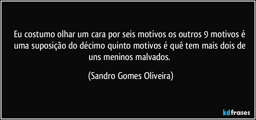 Eu costumo olhar um cara por seis motivos os outros 9 motivos é uma suposição do décimo quinto motivos é quê tem mais dois de uns meninos malvados.
