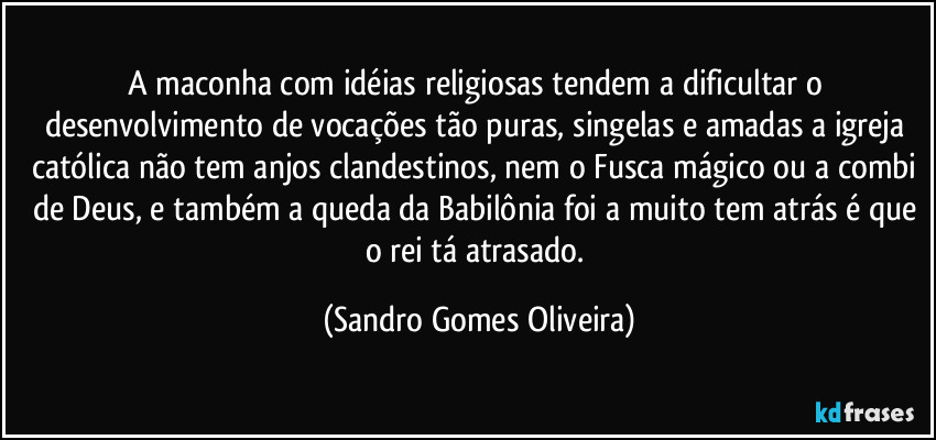A maconha com idéias religiosas tendem a dificultar o desenvolvimento de vocações tão puras, singelas e amadas a igreja católica não tem anjos clandestinos, nem o Fusca mágico ou a combi de Deus, e também a queda da Babilônia foi a muito tem atrás é que o rei tá atrasado.