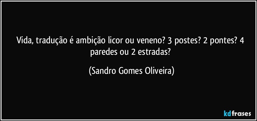 Vida, tradução é ambição licor ou veneno? 3 postes? 2 pontes? 4 paredes ou 2 estradas?