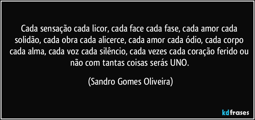 Cada sensação cada licor, cada face cada fase, cada amor cada solidão, cada obra cada alicerce, cada amor cada ódio, cada corpo cada alma, cada voz cada silêncio, cada vezes cada coração ferido ou não com tantas coisas serás UNO.