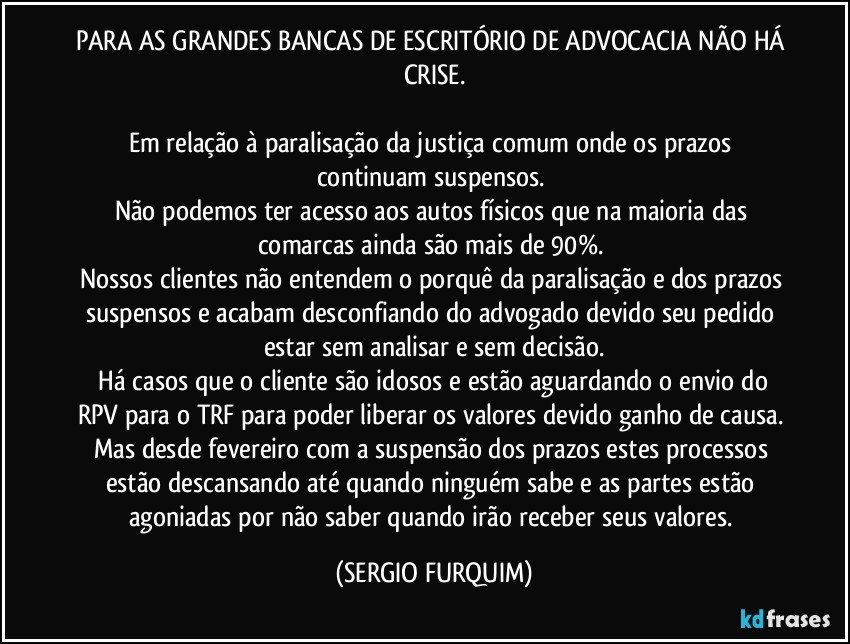 Há casos que o cliente são idosos e estão aguardando o envio do RPV para o TRF para poder liberar os valores devido ganho de causa. Mas desde fevereiro com a suspensão dos prazos estes processos estão descansando até quando ninguém sabe e as partes estão agoniadas por não saber quando irão receber seus valores.